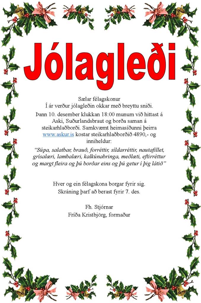 Sælar félagskonur Í ár verður jólagleðin okkar með breyttu sniði. Þann 10. desember klukkan 18:00 munum við hittast á Aski, Suðurlandsbraut og borða saman á steikarhlaðborði. Samkvæmt heimasíðunni þeirra www.askur.is kostar steikarhlaðborðið 4890,- og inniheldur: “Súpa, salatbar, brauð, forréttir, síldarréttir, nautafillet, grísalæri, lambalæri, kalkúnabringa, meðlæti, eftirréttur og margt fleira og þú borðar eins og þú getur í þig látið” Hver og ein félagskona borgar fyrir sig. Skráning þarf að berast fyrir 7. des.